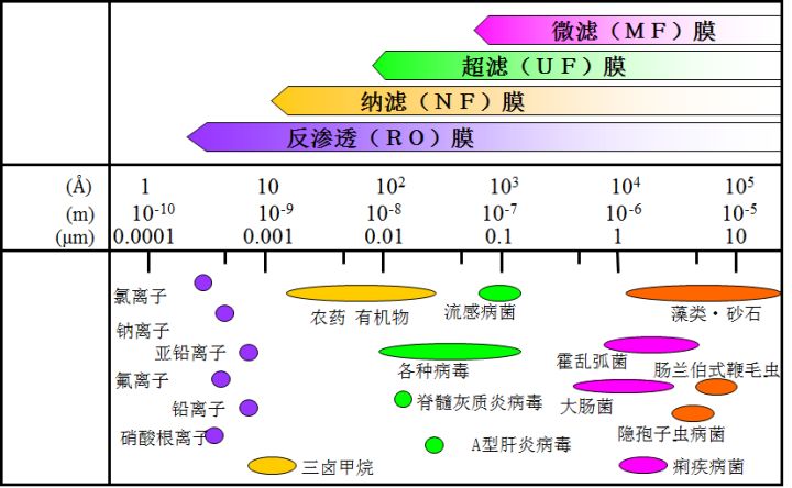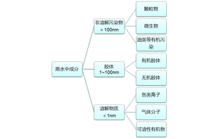 水是極好的分散體,導(dǎo)致通常看到的水里面都含有溶解或非溶解的有機(jī)物和無(wú)機(jī)物。去除這些污染物,或者把它們從水中分離出去。按照污染物的尺寸分類將更加有效,這可以關(guān)聯(lián)到我們可以采用何種技術(shù)去去除,比如按如下分類: